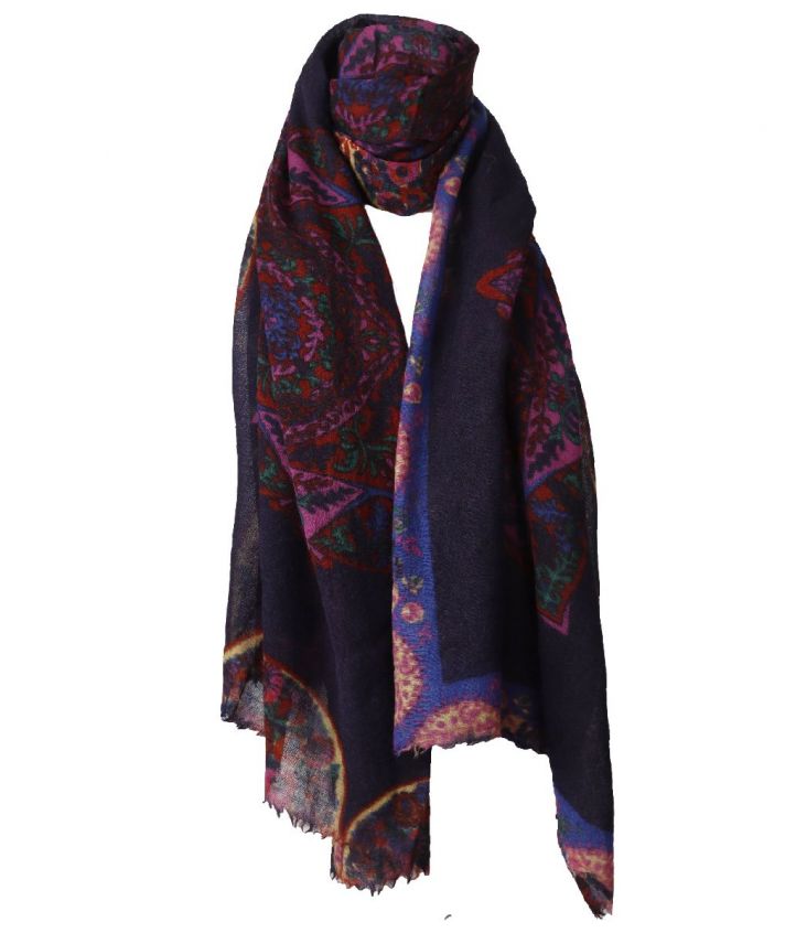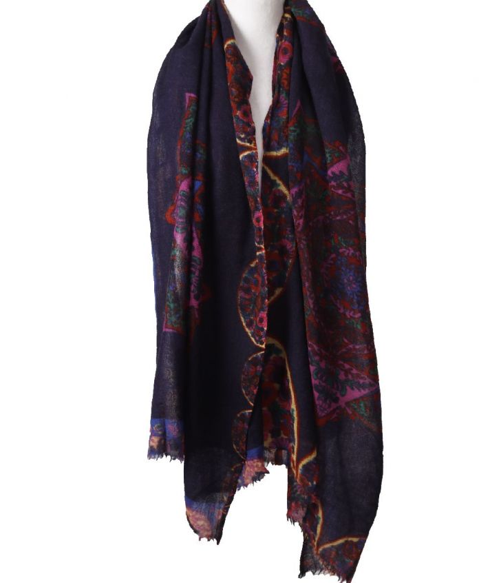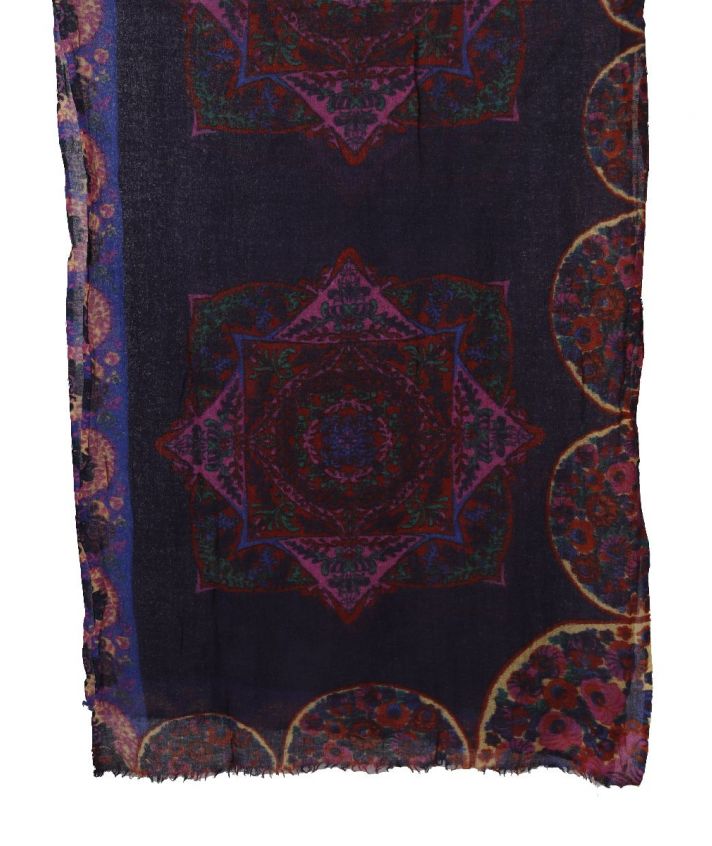 Donkerblauwe mousseline sjaal met een elegante ornamentprint. Het lichte, ademende materiaal biedt comfort en veelzijdigheid, waardoor deze sjaal perfect is voor zowel dagelijks gebruik als speciale gelegenheden.
