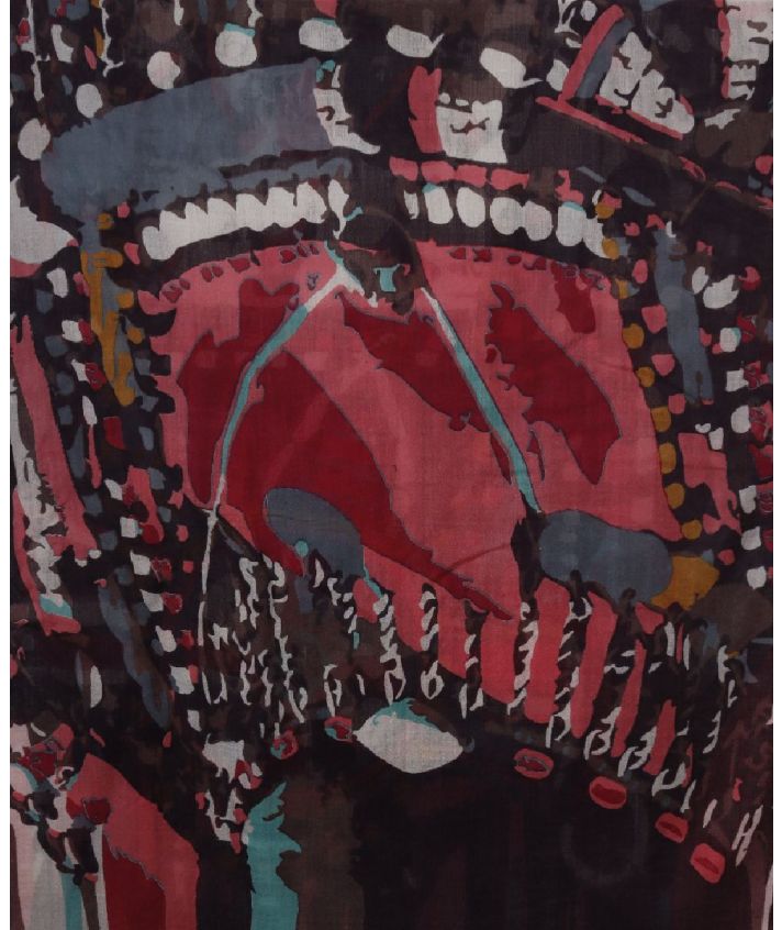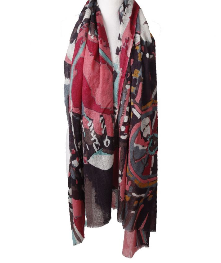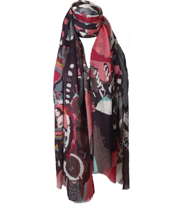Donkerbruine wolmousseline sjaal met abstracte print in roze, ivoor, petrol en turquoise. Dun geweven voor een luchtig en zacht draagcomfort.