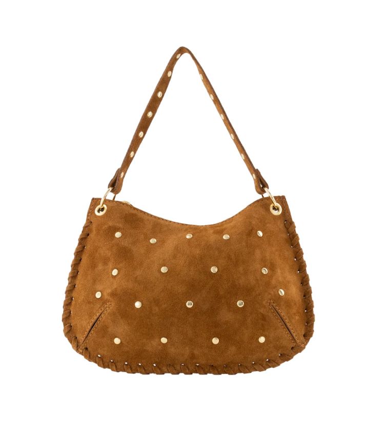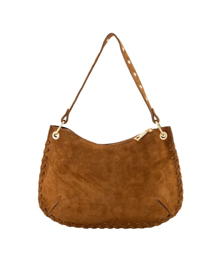 De Dune suède leren tas in cognac bruin is een compacte eyecatcher met stoere studs en verfijnde gevlochten details. Het kleine formaat maakt hem ideaal voor je belangrijkste essentials, terwijl de stijlvolle look elke outfit compleet maakt. Dankzij het verstelbare hengsel draag je de tas comfortabel crossbody of over de schouder. Binnenin vind je een ruim hoofdvak met een afsluitbaar steekvakje voor kleine items.