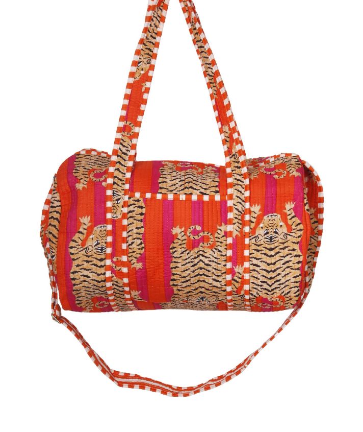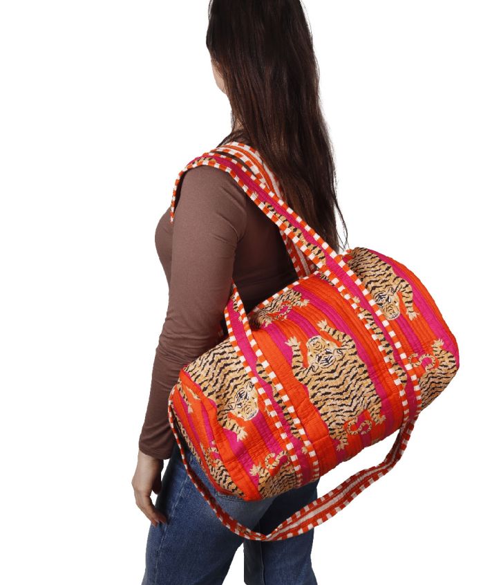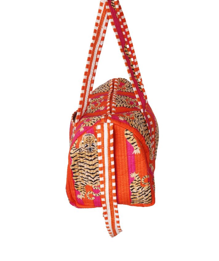 Gewatteerde tas met tijgerprint in roze en rood. Deze praktische, ruime en stijlvolle tas heeft zowel aan de voorkant als binnenkant een extra opbergvak en sluit je eenvoudig en veilig met een rits. Perfect voor op vakantie, een citytrip of als sporttas. Dankzij het ruime ontwerp heb je altijd genoeg plek voor al je essentials.