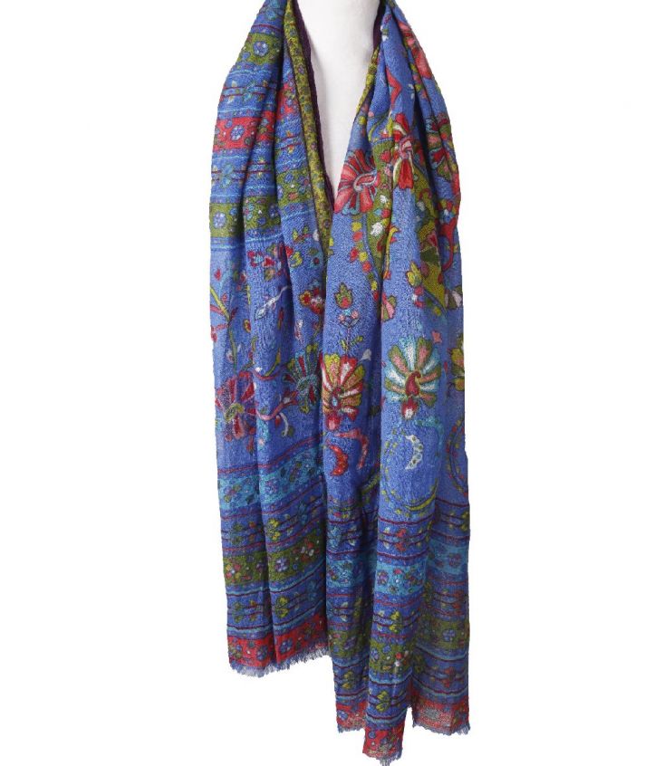 Hemelsblauwe wollen mousseline sjaal met een subtiele floralprint. Gemaakt van fijn geweven dun wol, voelt deze sjaal licht aan.