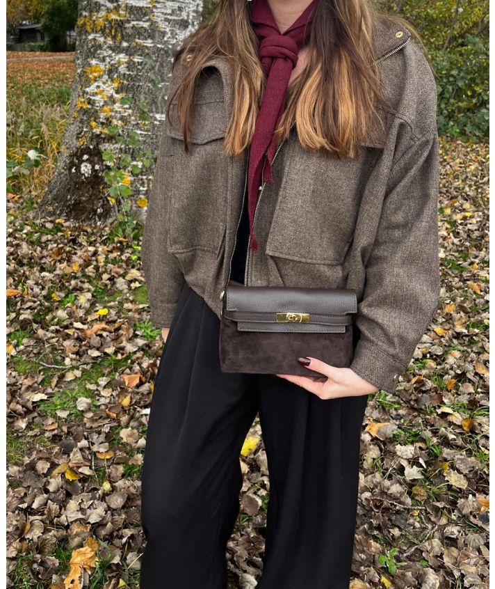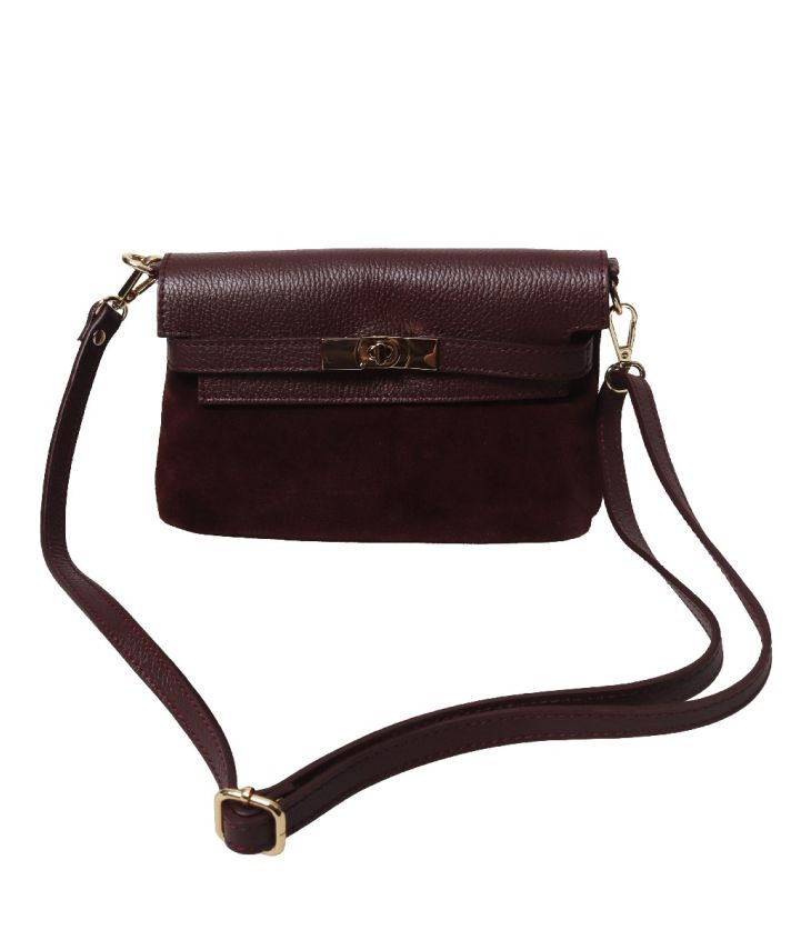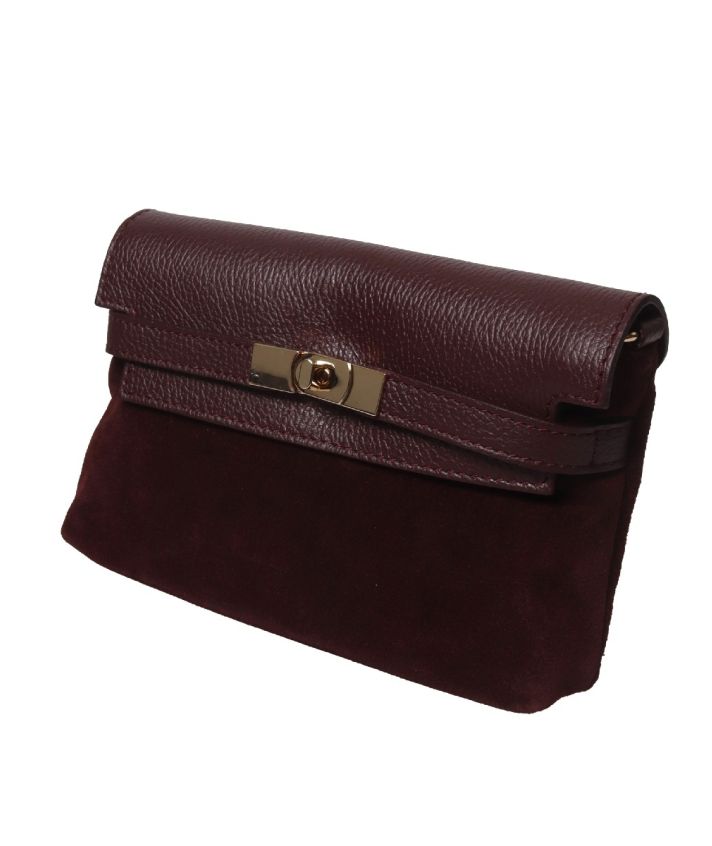 De Jolie clutch tas is gemaakt van suède en hoogwaardig grain leer in burgundy rood, met een tijdloos design. De voorzijde is afgewerkt met een elegante draaisluiting en subtiele goudkleurige hardware. Dankzij het afneembare en verstelbare leren hengsel draag je de clutch tas zowel in de hand als crossbody — perfect voor dagelijks gebruik of een avondje uit.