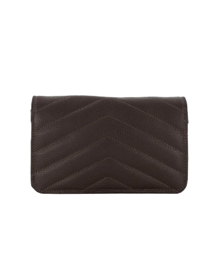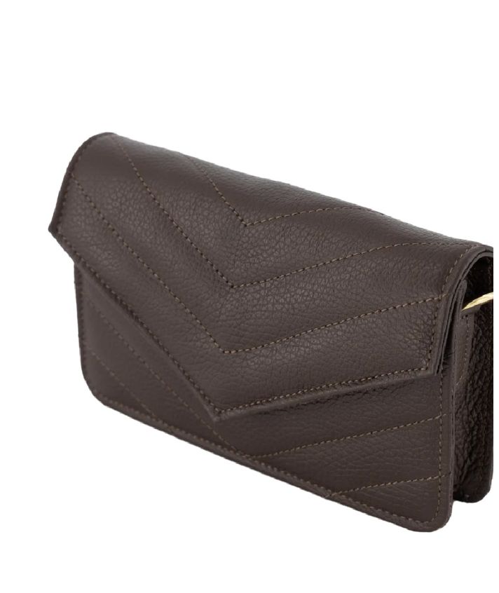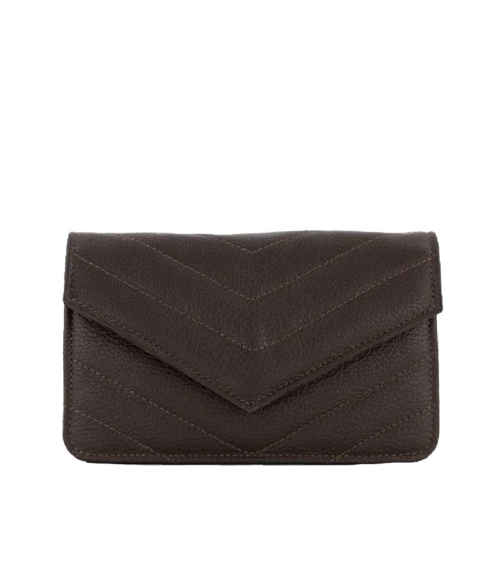 Deze elegante clutch in taupe is met vakmanschap vervaardigd in Italië van hoogwaardig grain leer, bekend om zijn luxe structuur en duurzaamheid.
