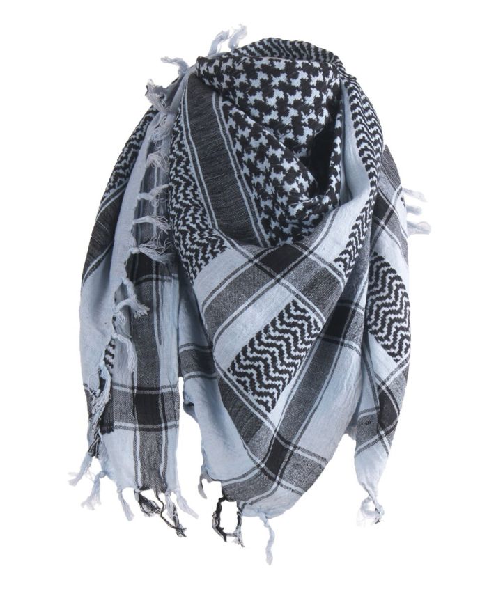 Originele PLO sjaal / Arafatsjaal in zwart en lichtblauw met kwasten rondom. De sjaal is geweven met stevig katoen.