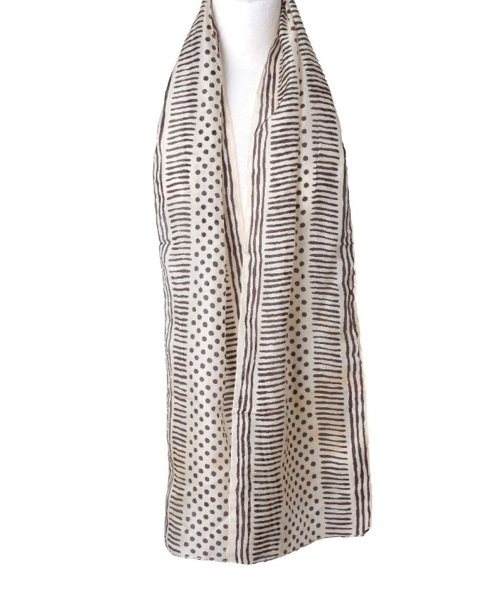Dit elegante zijden sjaaltje in ecru met polkadot dessin is een verfijnde toevoeging aan je garderobe. De lichte, zachte zijde valt soepel en voelt heerlijk comfortabel aan.