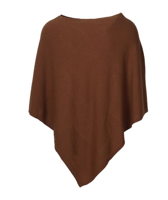 Bruine poncho met ronde hals, vervaardigd uit hoogwaardige materialen zoals premium-kasjmier, wol en viscose. Deze stijlvolle keuze straalt zowel comfort als klasse uit.