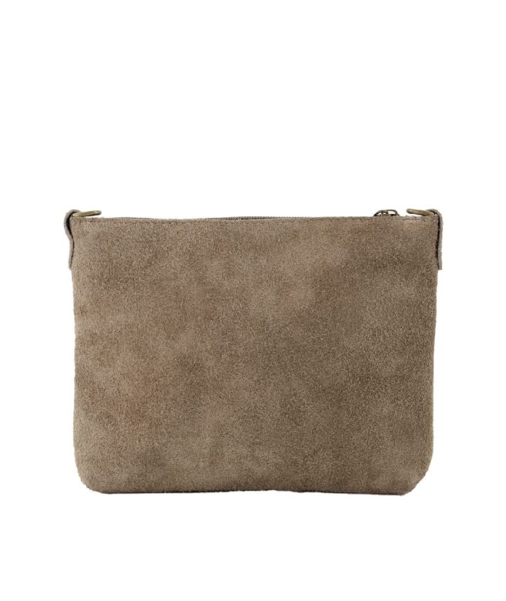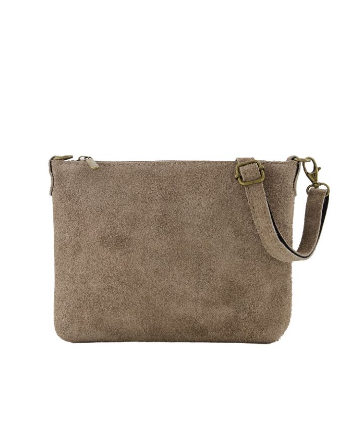 Leren suède crossbody tas in taupe met afneembaar en verstelbaar hengsel van 125 cm.