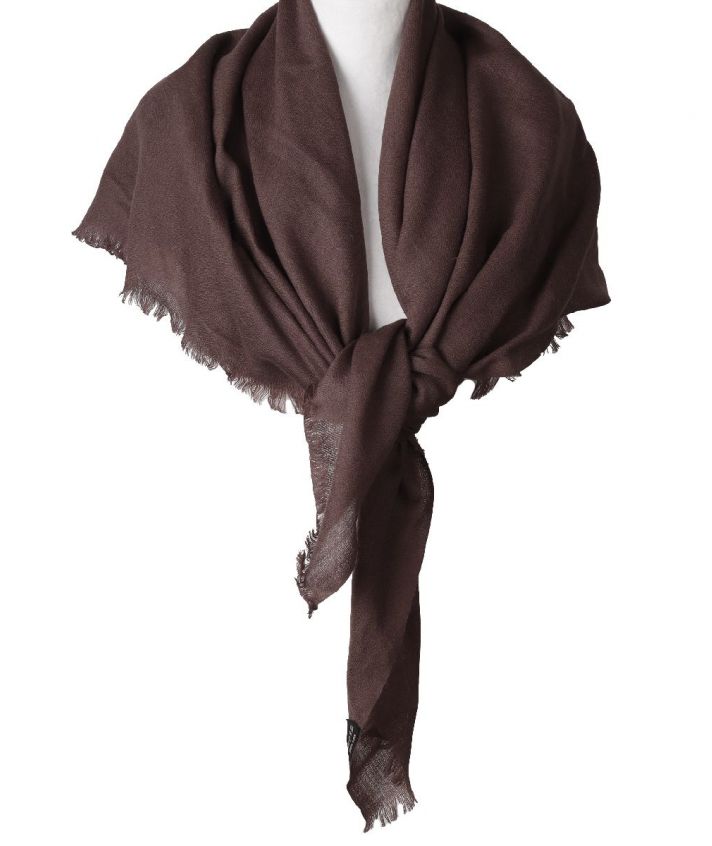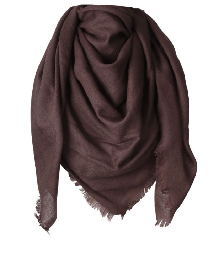 Lichtgeweven vierkante sjaal van zachte mousseline wol in bruin, met franjes rondom.