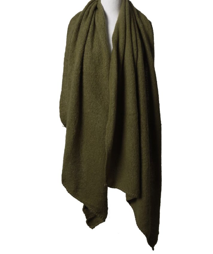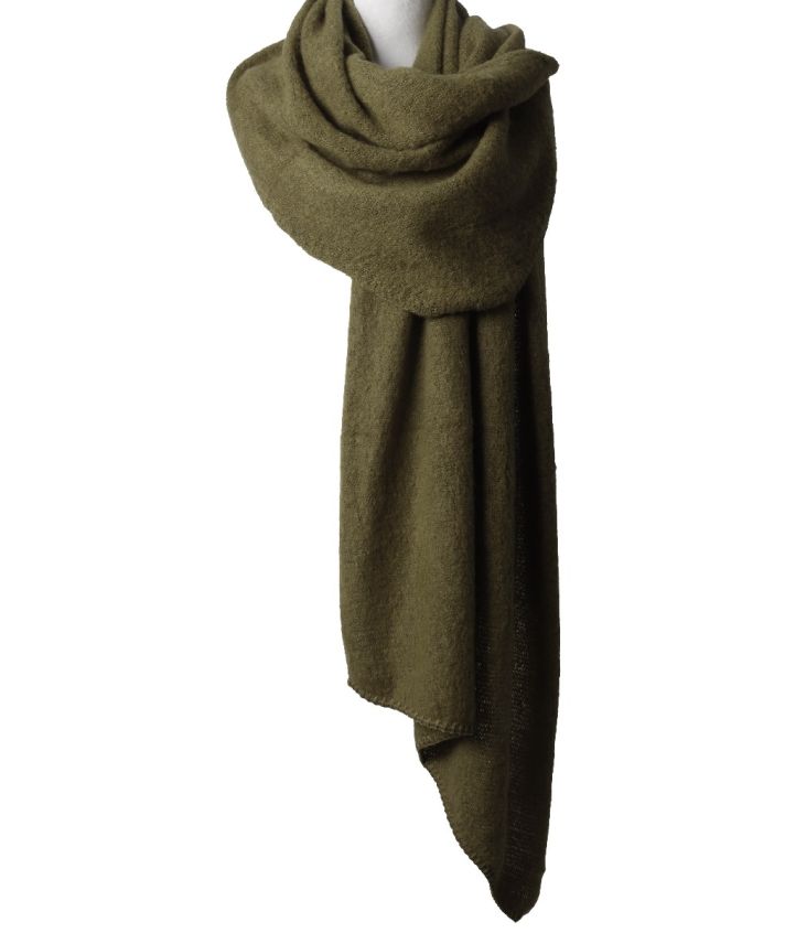 Superzachte wol-blend omslagdoek in olijfgroen, heerlijk warm en veelzijdig. Draag hem als omslagdoek of grote sjaal; het gehaakte stiksel geeft een stijlvolle afwerking.