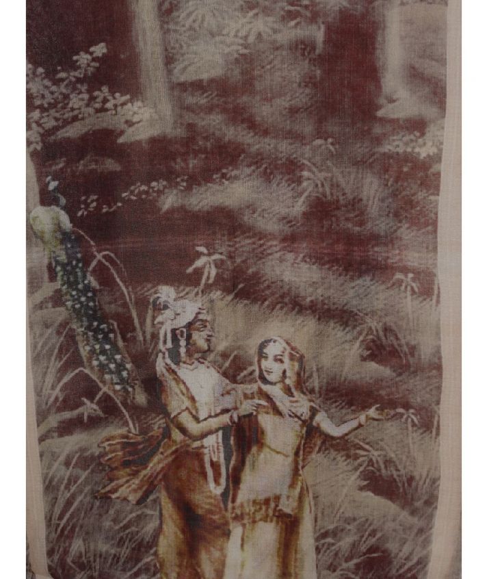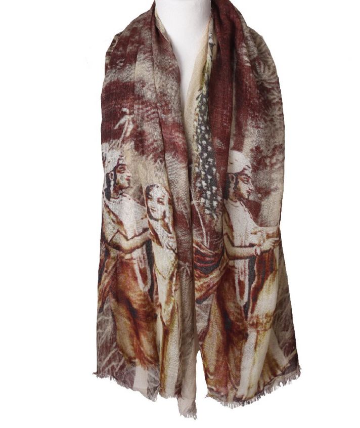 Wol-zijde sjaal met Indiaanse afbeelding in bruin-tinten. De sjaal is lichtgeweven met wol en zijde en voelt zacht en luchtig aan.