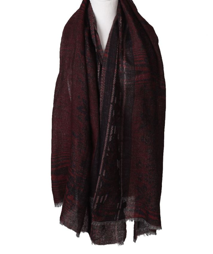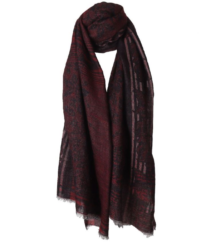 Wol mousseline sjaal met bloemenprint in rood, wit, grijs en zwart, gemaakt van licht geweven wol.