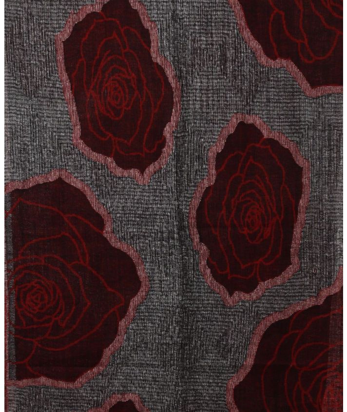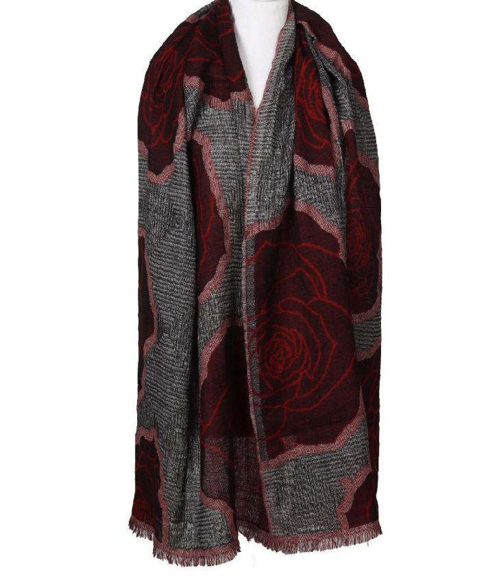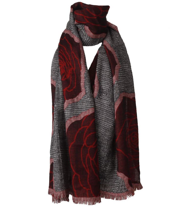 Wollen sjaal met een geweven rozenpatroon in warme roodtinten. De achtergrond heeft een gemêleerd zwart-wit ontwerp, wat zorgt voor een mooi contrast en diepte.