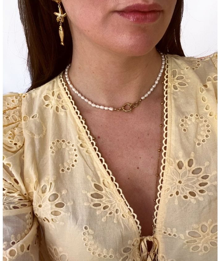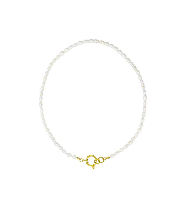 Een sieraad met karakter – deze ketting is gemaakt van natuurlijke zoetwaterparels en verfijnd met een subtiel goudkleurig detail. Elke parel is uniek in vorm en glans, wat deze ketting een authentiek en elegant karakter geeft.